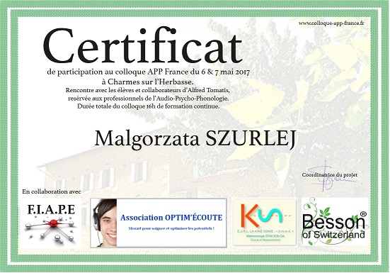 Sprawozdanie z tej konferencji zamieszczone jest na stronie Federacji Audio-Psycho-Fonologów i Terapeutów Uwagi Słuchowej www.fiape.ch Dużo ciekawych informacji na ten temat można też znaleźć na stronie www.colloque-app-france.fr